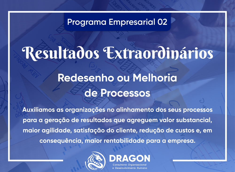 O Programa Empresarial Resultados Extraordinários, compreende os serviços de Redesenho ou Melhoria de Processos, concebido para alinhar os seus processos gerando uma proposta que agregue valor substancial, maior agilidade, satisfação do cliente, redução de custos e, em consequência, maior rentabilidade para a empresa.
