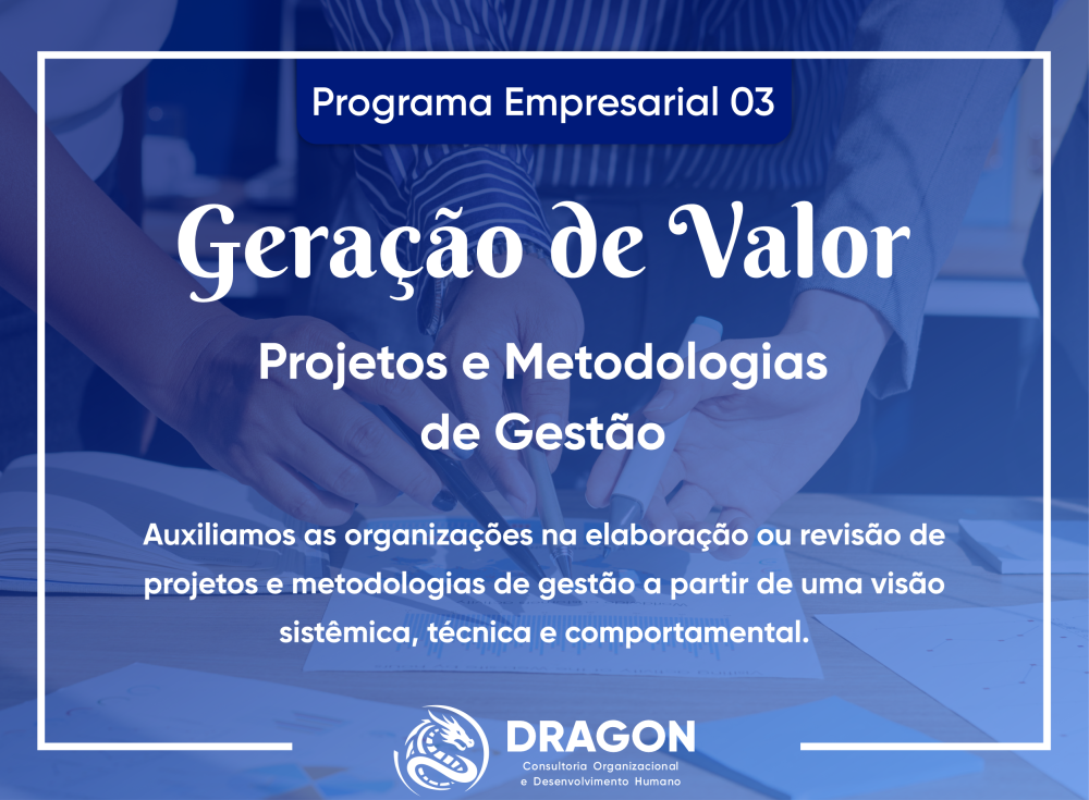 Os serviços de Desenvolvimento de Projetos e Metodologias de Gestão, do Programa Empresarial Geração de Valor, são conduzidos com uma visão sistêmica, técnica e comportamental envolvendo as equipes do cliente para que todos sintam-se parte da solução e comprometidos com ela, em todas as etapas, compreendendo: